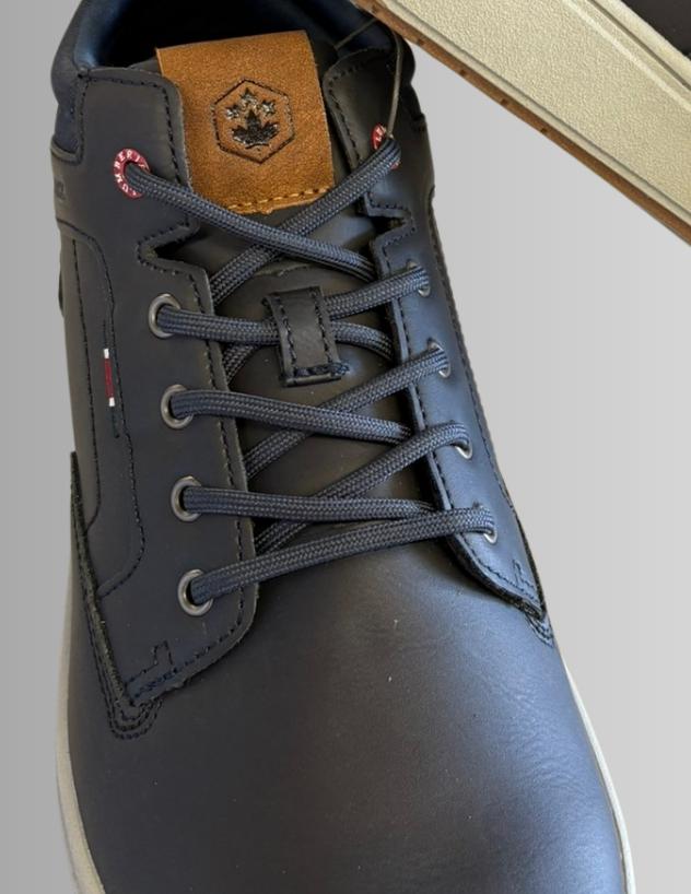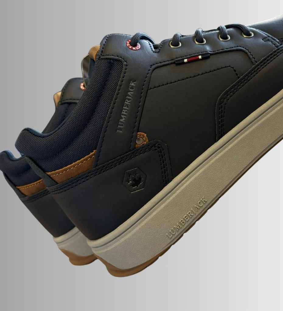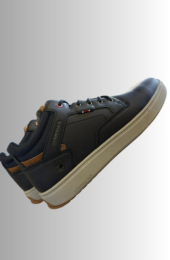 Sneakers uomo Lumberjack dal design sportivo e versatile. Realizzate in materiale tecnico e pelle sintetica, presentano una tomaia blu scuro con dettagli a contrasto color cuoio e inserti tessili per una maggiore traspirabilità. La suola bicolor in gomma garantisce aderenza e comfort durante tutta la giornata, rendendole ideali sia per il tempo libero che per uno stile urbano casual. Chiusura con lacci per una calzata sicura e personalizzabile.