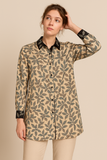 Camicia da donna Elisa Castelli, modello a fantasia con vestibilità over. Le maniche lunghe terminano con polsini a tre bottoni, mentre collo e polsi in contrasto aggiungono un tocco distintivo al design. L’allacciatura frontale con bottoni e il fondo diritto con spacchi laterali completano il capo, garantendo comfort e praticità. Una camicia leggera e versatile, ideale per look casual e raffinati.