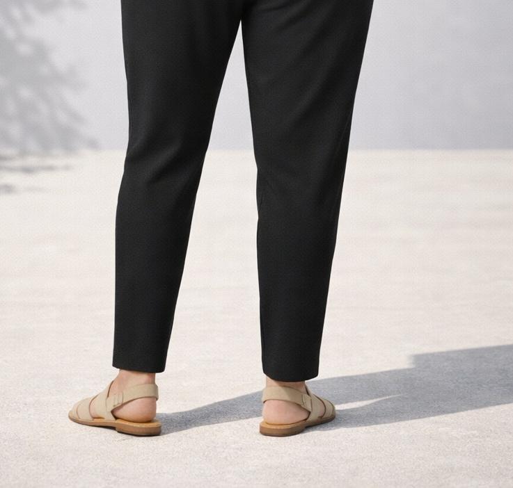 La gamba scende morbida e si restringe a sigaretta sul fondo, valorizzando la silhouette con un taglio moderno ed essenziale.